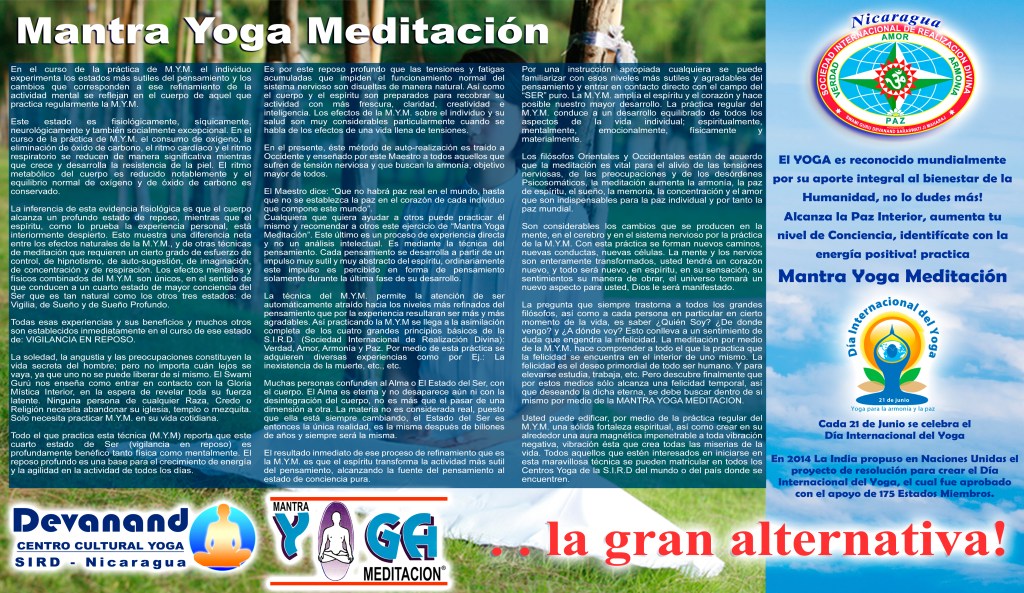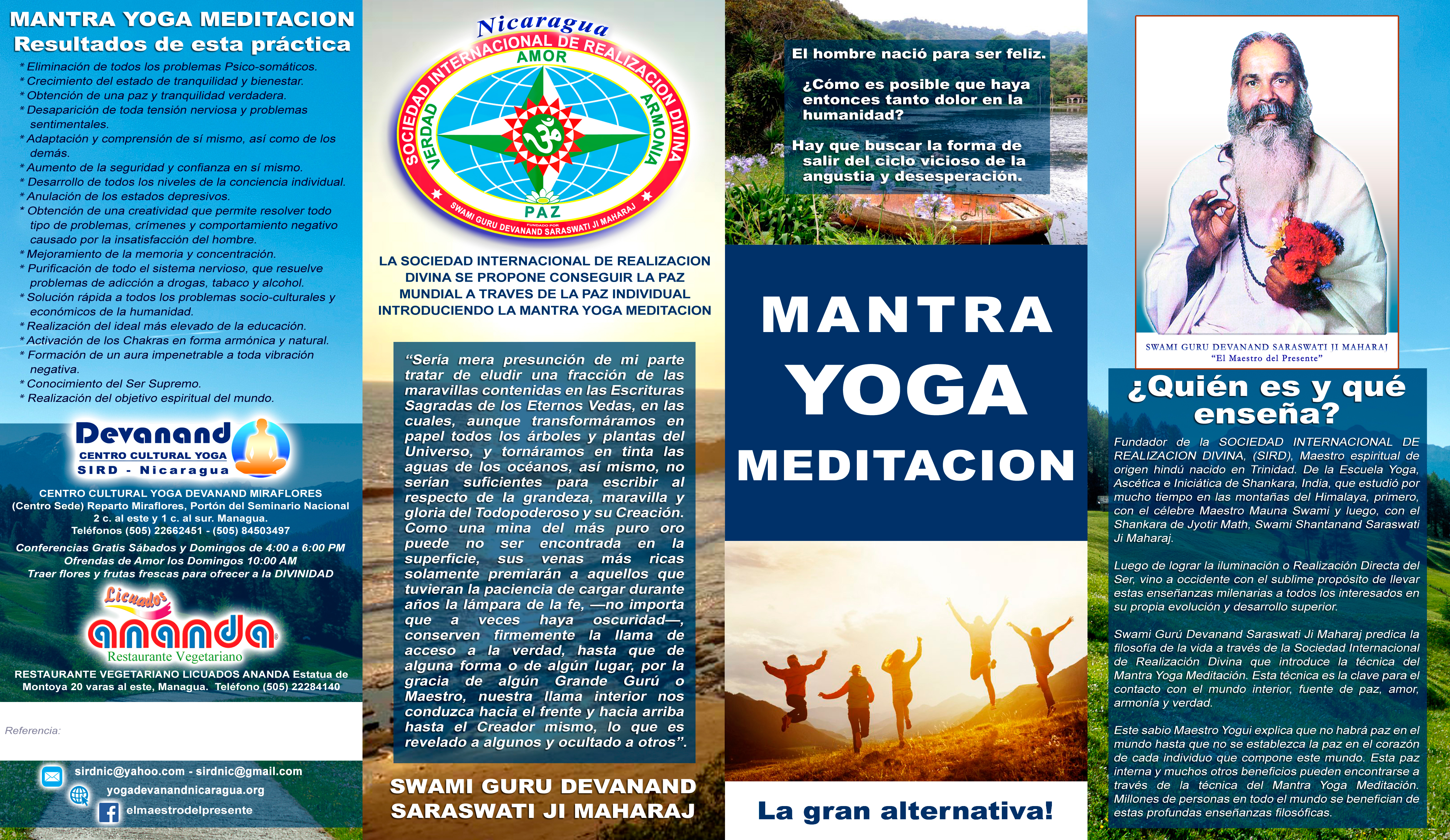 La técnica del Mantra Yoga Meditación permite la atención de ser automáticamente atraído hacia los niveles más refinados del pensamiento, que por la experiencia resultaran ser más y más agradables. Así, practicando la M.Y.M se llega a la asimilación completa de los cuatro grandes principios básicos de la S.I.R.D. (Sociedad Internacional de Realización Divina): Verdad, Amor, Armonía y Paz. Por medio de esta práctica se adquieren diversas experiencias como por ejemplo: La inexistencia de la muerte, etc.